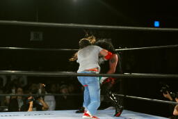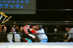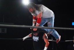 スターバックコーナーに追い込んでパンチ連打(右写真)。ニードロップ、エルボースタッブ。