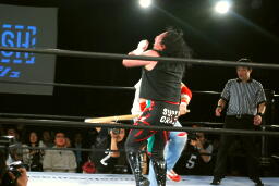 さらにネックブリーカードロップ(右写真)、カウント2。