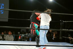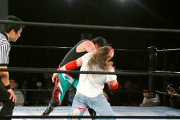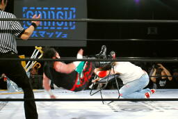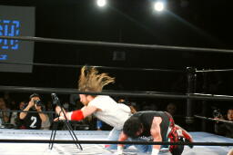 クレイジーを場外に落としてエルボー(右写真)、エプロンに背中をぶつける。