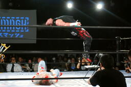 今度はイスからムーンサルト(左写真)、カウント2。