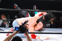 クレイジーエルボー(右写真)、踏みつけ。5分経過。