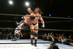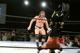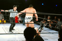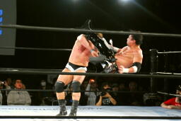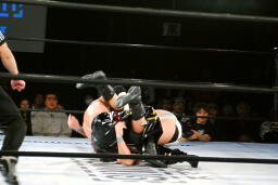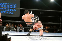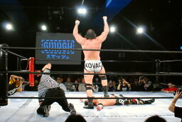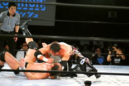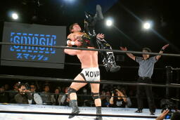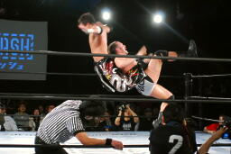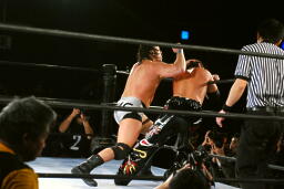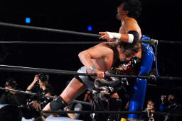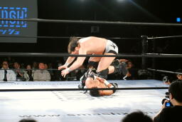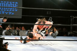 TAJIRIコーナーに上る、コバック追いかけて雪崩式パワースラム(左写真)、カウント2。10分経過。