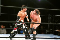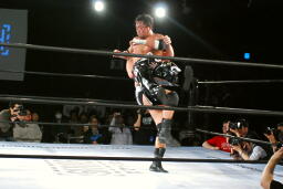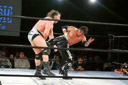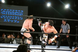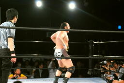 コバックターンバックルにぶつける、TAJIRI3発目ブロックしてぎゃくにぶつける。TAJIRI逆水平連打、コーナーに振る、コバック切り返してコバックラリアット(左写真)。5分経過。