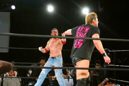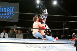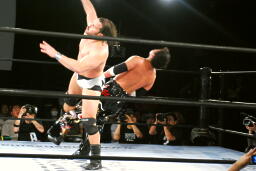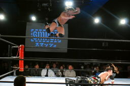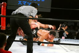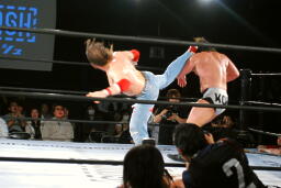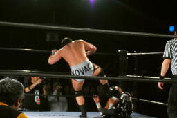 コバックヨーロピアンアッパーカット(右写真)、エルボードロップ、カウント2。ボディスラムからサマーソルトドロップ、カウント2。
