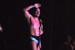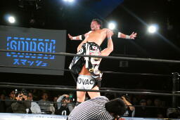 ベルトを奪い取り自分の腰に巻いて見せる(左写真)。TAJIRIを場外に出し客席でエルボー、そして「イチバーン!」ええええ・・・。TAJIRIをリングに戻す。