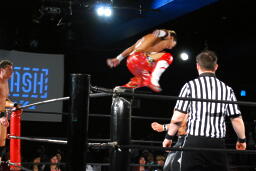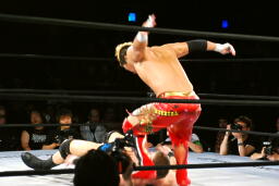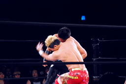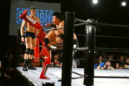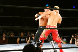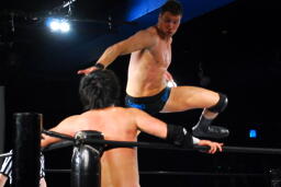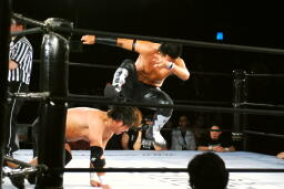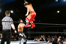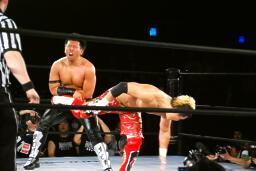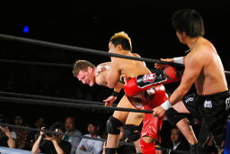 大原エルボー連打、ヘッドロック、KUSHIDAロープに振る、大原ショルダーブロック(左写真)。ロープワークからKUSHIDAがトップロープをつかんでのヘッドシザーズホイップ、そしてドロップキック。両軍タッチ。