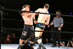 KUSHIDAフルネルソン、大原ブロック(右写真)。大原ブレークしてロープに飛ぶ、KUSHIDAジャンピングハイキック、木藤にタッチ。