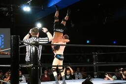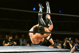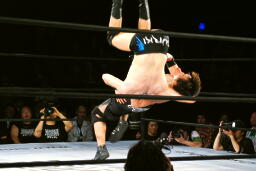 木藤フィッシャーマンバスター、カウント2。ロープに振ってラリアット、大原かわしジャーマン(右写真)。大原ブレーンバスター、カバーはKUSHIDAがカット。クルキィーを呼び込む。