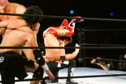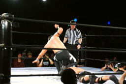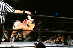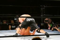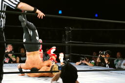 クルキィーブレーンバスター(左写真)からエルボードロップ、カウント2。クルキィーコーナーに詰めてガットショット、ブレーンバスターからエルボードロップ、今度はカウント1。そしてその場跳びムーンサルト、この身長で動き軽いと言えば聞こえはいいが当たりはいまいち。ネックロックに捕らえて大原にタッチ。5分経過。