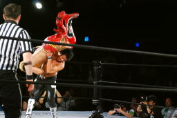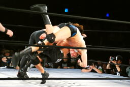大原再度スリーパー、木藤ヒジでブレークしてロープに飛ぶ、大原カウンターのフォアアーム、カウント2。大原ロープに振る、木藤ブロックしてバックドロップ(右写真)、KUSHIDAにタッチ。