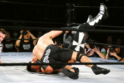 そしてスワンダイブのヒップドロップ(左写真)、クルキィーに「見とけよ」というジェスチャーしてその場跳びムーンサルトプレス。こっちはきれいなフォームで威力も十分。悔しがるクルキィー。カバーはカウント2。