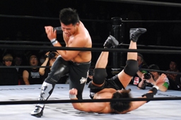 木藤が5回目で倒す(左写真)。アームロックに捕らえてKUSHIDAにタッチ。