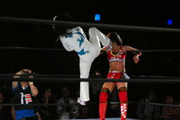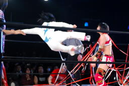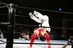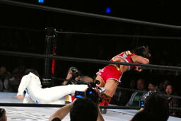 リンコーナーに上ってムーンサルトプレス、朱里かわす(右写真)。
