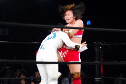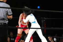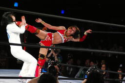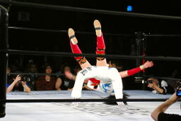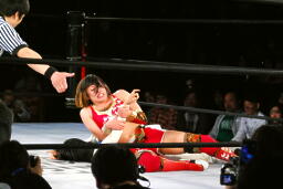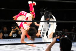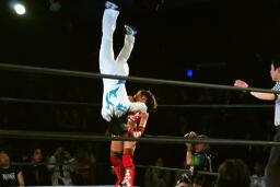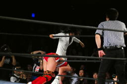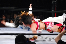 バックの取り合いからリンがジャーマン(左写真)、カウント2。