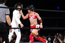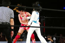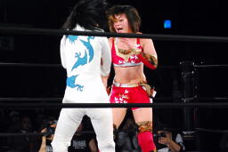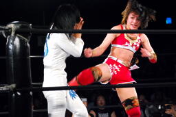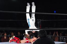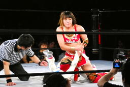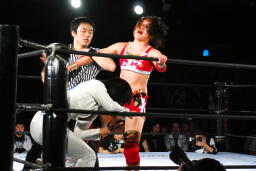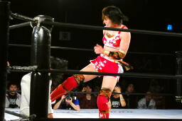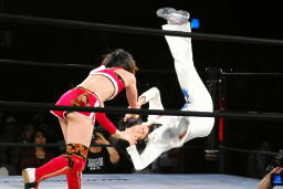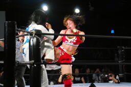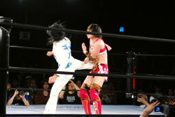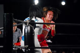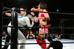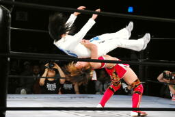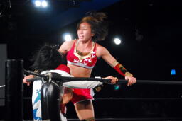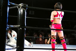 リンコーナーに上る、朱里デッドリードライヴ(左写真)。