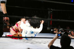 紙テープまみれの朱里を場外に蹴落とす(左写真)。場外で鉄柱攻撃、南側カウンター席の側でブレーンバスター、その上にイスを積み上げてカウンター席からサマーソルトドロップ。