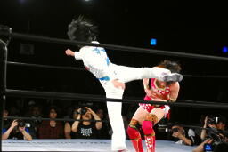 頭にソバット(右写真)、カウント2。