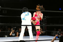 朱里ハイキック(右写真)、カバー、リンはカウント2で返す。