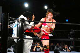 リンロープに飛ぶ、朱里はカウンターのトラースキック(左写真)、