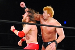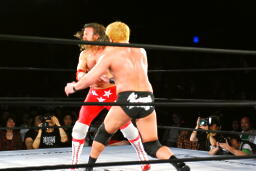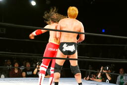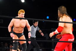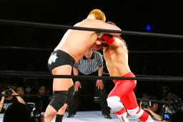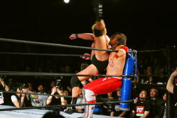 スターバックもチョップ(左写真)。ヘッドロックに捕らえフライングメイヤーからグラウンドヘッドロック。大森立ち上がってコーナーに押し込みブレーク。