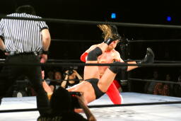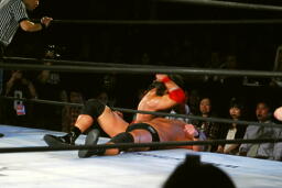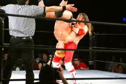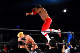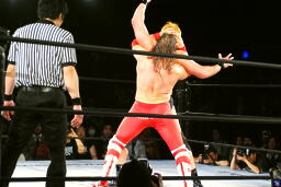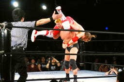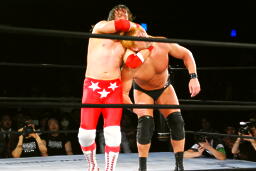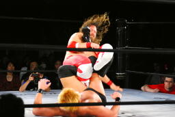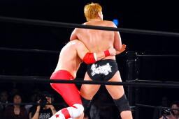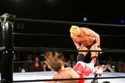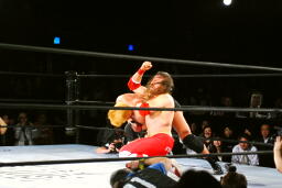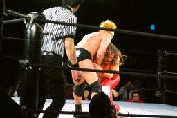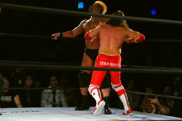 スターバックパンチ連打、大森はチョップ返す。大森コーナーに詰めて得るb−スマッシュ連打、スターバックはサミング。スターバック大森をコーナーに振って突っ込む、大森はカウンターのキック。これが3回続く。大森はフルネルソンバスター(左写真)。