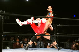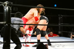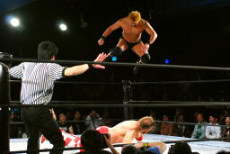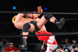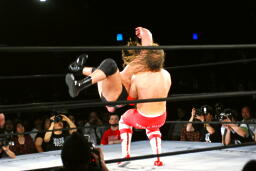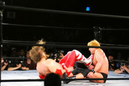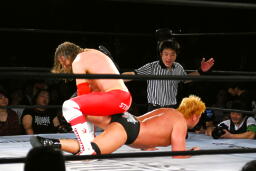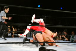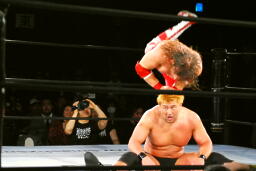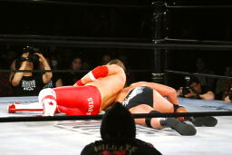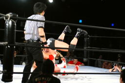 大森逆さ押さえ込みに切り返すが(右写真)肩のロックが外れカウントには至らず。スターバックニースタンプ、ヘッドバット。5分経過。