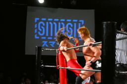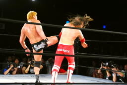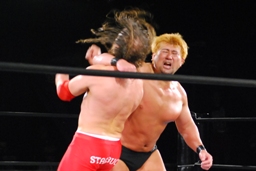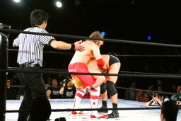 スターバック腕取ってワキ固め(左写真)、大森ロープ。スターバックは大森を場外に出してエルボースタッブ3連発。両者リングに戻る。