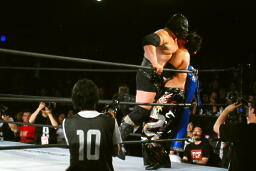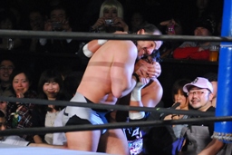 TAJIRIはエプロンに戻って来たコバックにハンドスプリングキック(右写真)。