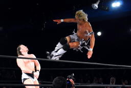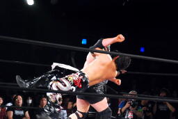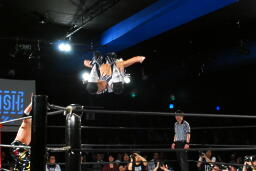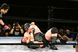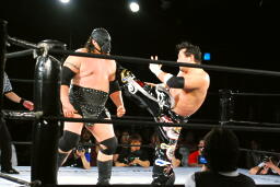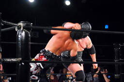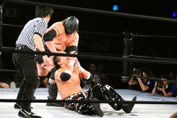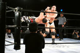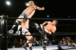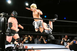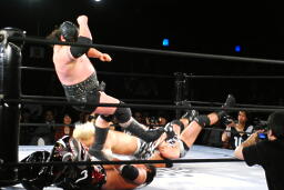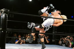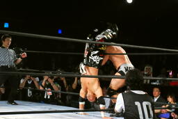 リバーススプラッシュ(左写真)、TAJIRIかわしてドロップキック、AKIRAにタッチ。