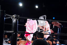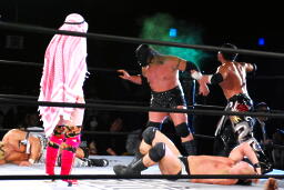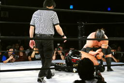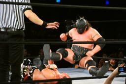 サイボニックマシーンはAKIRAを場外に出し、TAJIRIの首をひねってギロチンドロップ(左写真)。ロープに飛んでビッグブーツ。