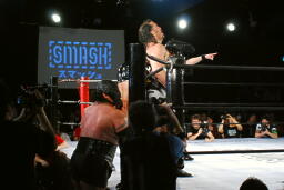 旗揚げからのメンバーが減って行くSMASH(ヴェテラン勢の参戦はあるが)。TAJIRIは何を考える?(右写真)。