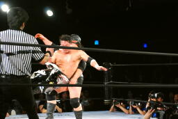 TAJIRIチョップ、ロープに飛ぶ、サイボニックマシーンカウンターのバックエルボー(左写真)5分経過。
