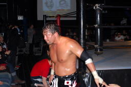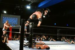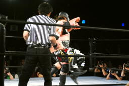 TAJIRIがドロップキック、コーナーに振る、コバック切り返す、TAJIRIエプロンに出てタランチュラ狙うがサイボニックマシーンが阻止(右写真)。コバックサイドスープレックス、サイボニックマシーンにタッチ。