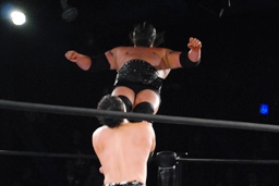 コーナーに上ってミサイルキック(左写真)、カウント2。
