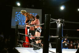 サイボニックマシーンロープに振る、TAJIRIハンドスプリングエルボー(右写真)、効き目なし。