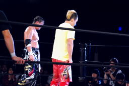 TAJIRIがKUSHIDAをリングに呼び込んで新日本への移籍を発表(左写真)。TAJIRIは「円満移籍」を強調。KUSHIDAは無言。