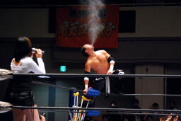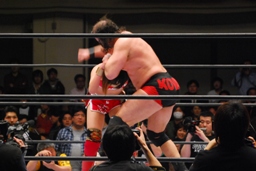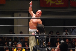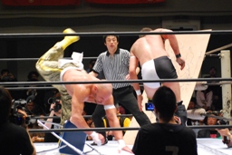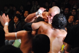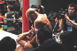 TAJIRIイス攻撃(左写真)。試合開始5分経過までリング上の闘い一切なし。