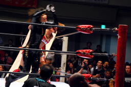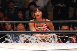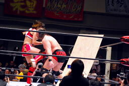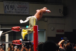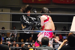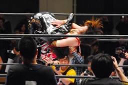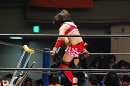 南側客席最上段まで上っていた朱里とリンがリングに戻って来た。朱里はリンの顔面をターンバックルにぶつける(右写真)。