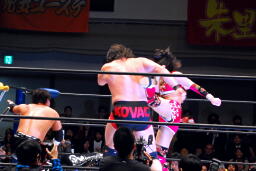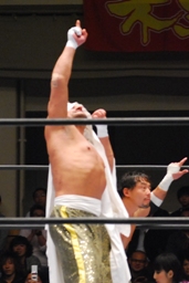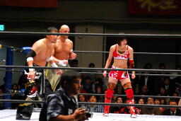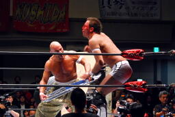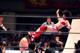 TAJIRIとダブルでロープに振る、コバック切り返す、TAJIRIハンドスプリングエルボー(左写真)。
