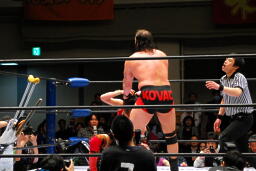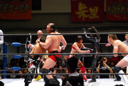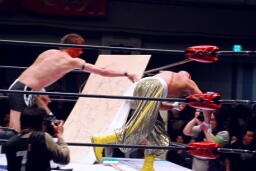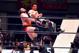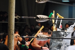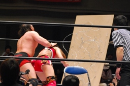 TAJIRIが朱里がコバックを逆にボードに振る、コバックは寸前でストップ(右写真)。アントニックが戻り2人にパンチ、コバックを救う。アントニックTAJIRIにボディスラム。しかしサブゥーが戻りアントニックを場外に。