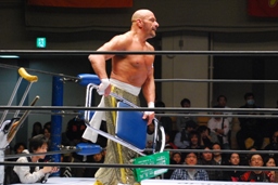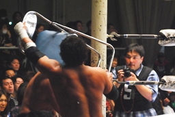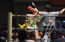 サブゥーがイス持ってリングに(左写真)。