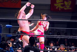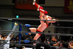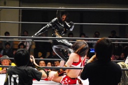 TAJIRIと朱里がリンをロープに振ってダブルのクローズライン、リンかわして2人にドロップキック(左写真)。