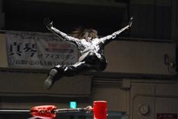 しかし場外で形勢逆転、サブゥーはリングに戻るとイスを踏み台にジャンプ(右写真)、