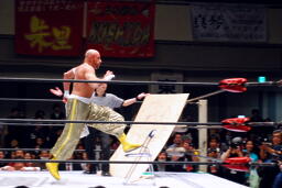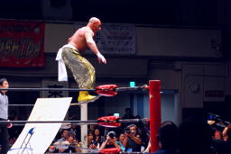 リングサイドの机にアントニックを寝せるとサブゥーはコーナートップからダイビングギロチンドロップ(左写真)。さすがはサブゥー、一人ハードコアだ。