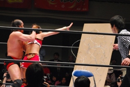 サブゥーはイスを踏み台にしてのコーナースプラッシュ狙うがアントニックはイスにキック、サブゥー転倒(右写真)。