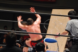 アントニックはサブゥーにその場跳びシューティングスタープレス、イス攻撃、場外に投げて(左写真)スライディングキック、そのまま場外にサブゥーを追う。