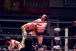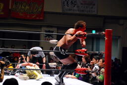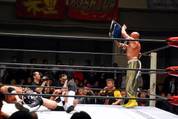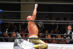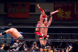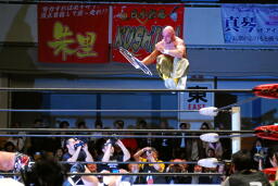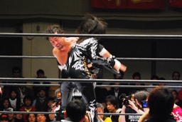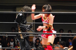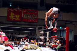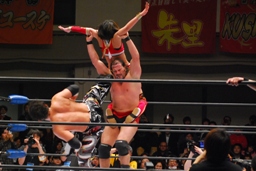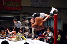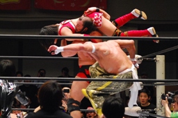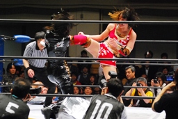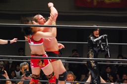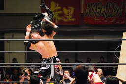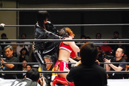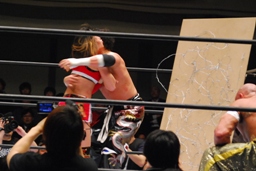 TAJIRIブレーンバスター、リンは身を翻して(右写真)着地。