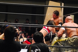 有刺鉄線ボードに振る、TAJIRIがかばう(左写真)。