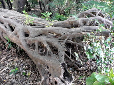 北海道日本ハムがキャンプやってる名護球場と今帰仁行きのバスが出る名護バスセンターどっちに向かうか(両方は近接)決めぬまま歩く。途中にあった不気味な原生林。