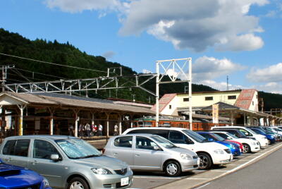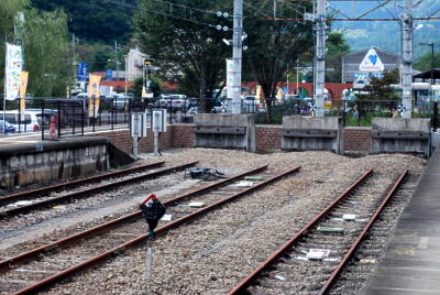 横川駅舎。往時よりかなり狭くなり、駐車場になっている。で、その駐車場にまだ線路が敷いてあったりする。